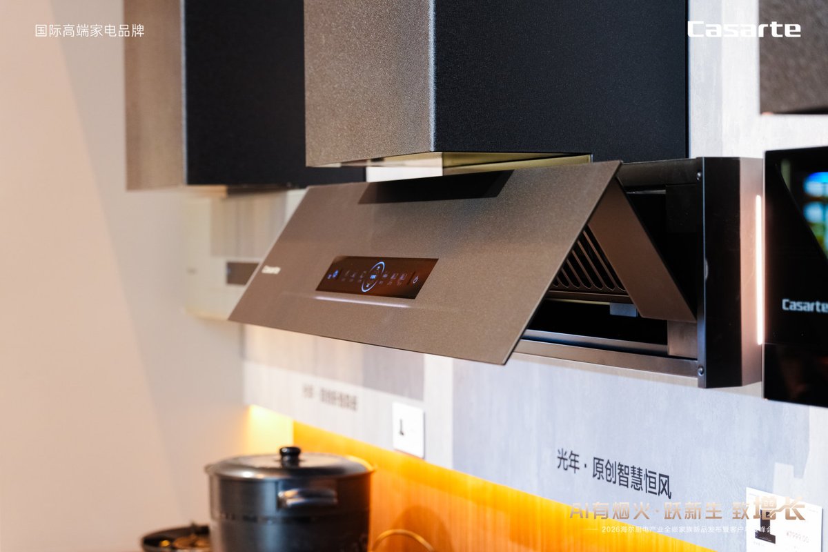 在刚刚结束的2026海尔大厨电产业全嵌家族新品发布会上,卡萨帝发布了全嵌家族致境系列、中岛升降油烟机、三折叠全能烟机、全域电磁灶等一系列新品和AI厨房场景,精准覆盖不同家庭的多元烹饪场景需求。其中,三折叠全能烟机不仅可以高效拢烟,还能轻松折叠,不挡视线、不挡锅,让用户不必在轻薄外观与强效净烟之间“二选一”。